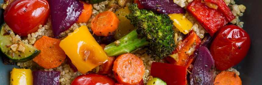 • Place cut up vegetables in large bowl, drizzle with a few tablespoons of olive oil