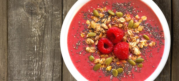 Place milk, apple, almond butter, frozen berries, ice cubes and ginger (if using) in a high power blender and puree. Pour into a bowl and add toppings of your choice.